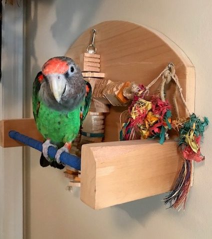 Maggie sur son aire de jeux mural qu’elle adore ! Nous avons mis du vetwrap autour du perchoir pour plus d’adhérence.