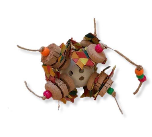 Small plasctic ball the size of a golf ball, with pieces of cork, bamboo shredders, neon beads and paper rope. Perfect for small birds.