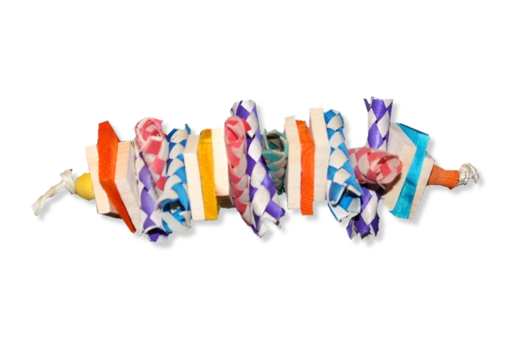 Toy made of natural and colored pine with paper fingers on sisal rope for small birds.