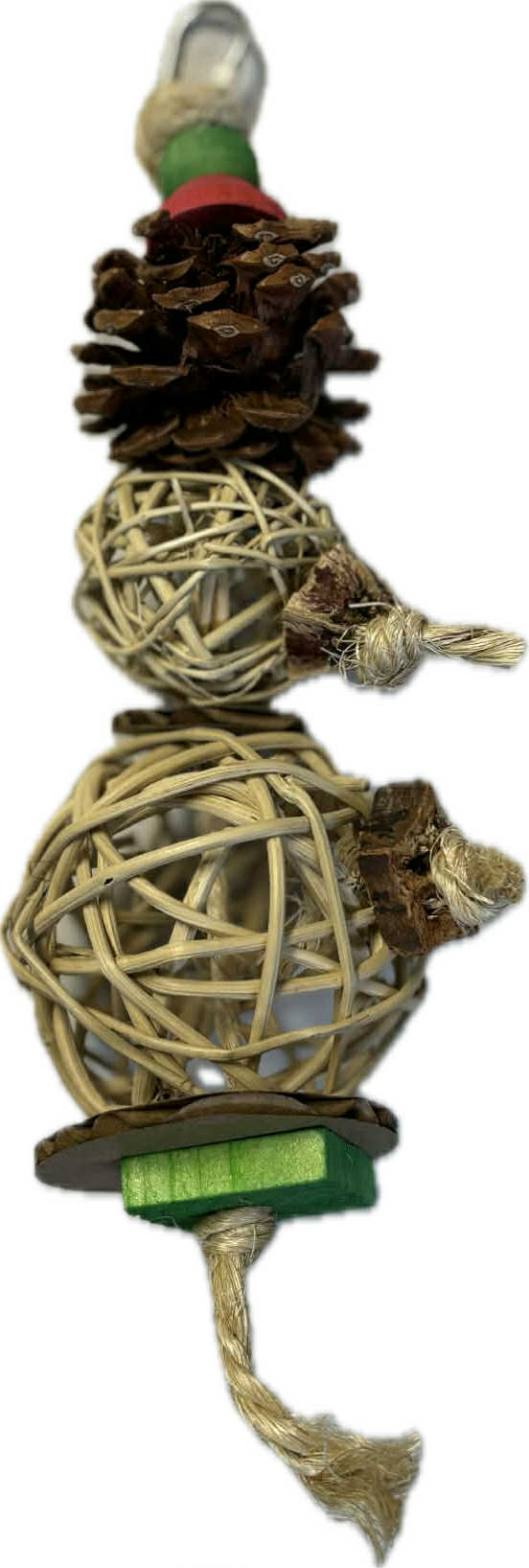 Toy for small and medium birds that they’ll enjoy shredding. Measures approximately 8 inches long by 4 inches wide. Made of vine balls in which you can hide treats, cardboard, mahogany slices for buttons, colored wooden pieces, a pine cone for a head, sisal rope, and a link.