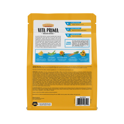 Safflower-based, sunflower-free diet for small parrots. As part of the family, a good quality diet is just as important for your pet as it is for the rest of the household. That’s why we created Vita Prima Safflower Formula Small Parrot Food to have all the essentials for your bird to live a happy and healthy life. With vitamin fortified pellets and a blend of wholesome seeds, grains, fruits, and vegetables, Vita Prima has all the nutrients birds need, natural flavors they want, and the variety to inspire their natural foraging instincts.